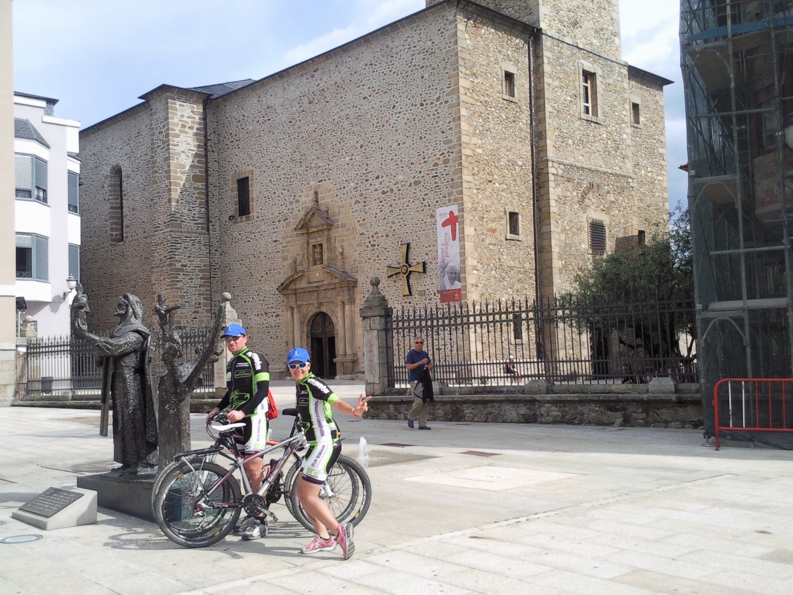 Posando junto a "El Caminante", delante de nuestro albergue en Astorga...