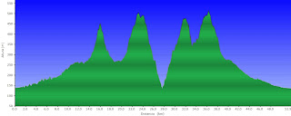 EL recorrido tuvo un desnivel positivo de 1071 metros y contó con la dificultad de 4 picos: uno en el km 16, 23, 32 y 36...desde allí todo fué bajada.